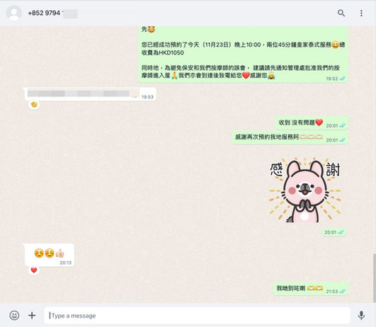 Massage Take Out 的服務人數已超過100位顧客!🎉 我們非常感謝每一位顧客的信任與支持。🙏以下是我們部分與客人的WhatsApp 預約記錄截圖,我們服務正規並且專業👍🏻 期待在未來繼續更多客人提供優質的按摩體驗!✨